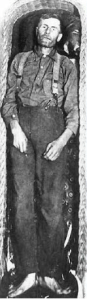That was Elmer’s swan song as a robber, and also as a breather. He left the crime scene and went to the ranch of a local acquaintance. After a night of drinking, he passed out in a barn. That’s where a posse of sheriff’s deputies found him the next morning. In the October 8, 1911 edition of the local paper, one of the deputies gave an account of the harrowing gunfight that finally ended with the law victorious. In reality, Elmer McCurdy died of a single gunshot wound that occurred when he was lying down, presumably in a drunken stupor.